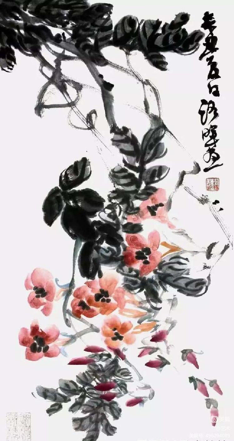 路晖女士的绘画作品之所以有大著其名的影响力,娴熟的专业功底是根本。她对画法的研磨精益求精,用笔有骨法之精神,也有没骨之生动,有骨画得钢打铁铸,没骨画得气韵生动,笔笔可作应物象形。每有作品呈现必然是笔里有墨,墨里有笔的前后相随,高低有趣。色彩渲染以达色不碍墨,墨不碍色的层次分明,又有水为道,彩为器的精心铺陈,以令画面流丽清许,纤尘不染,干净得如水洗濯沐,很有随类赋彩的唯美动感。无论从局部来看,还是从整体来观,路晖女士的花鸟作品都有令人杳然陶醉的画面质感,墨叶红花可以为天地张目,气韵生动可以为万物传神。如此精到的笔墨功夫,无论是画南国芭蕉沐朝韵,还是画一架凌霄渡春风,都带着东方审美的精气神,可以令丹青渊妙古今相续。