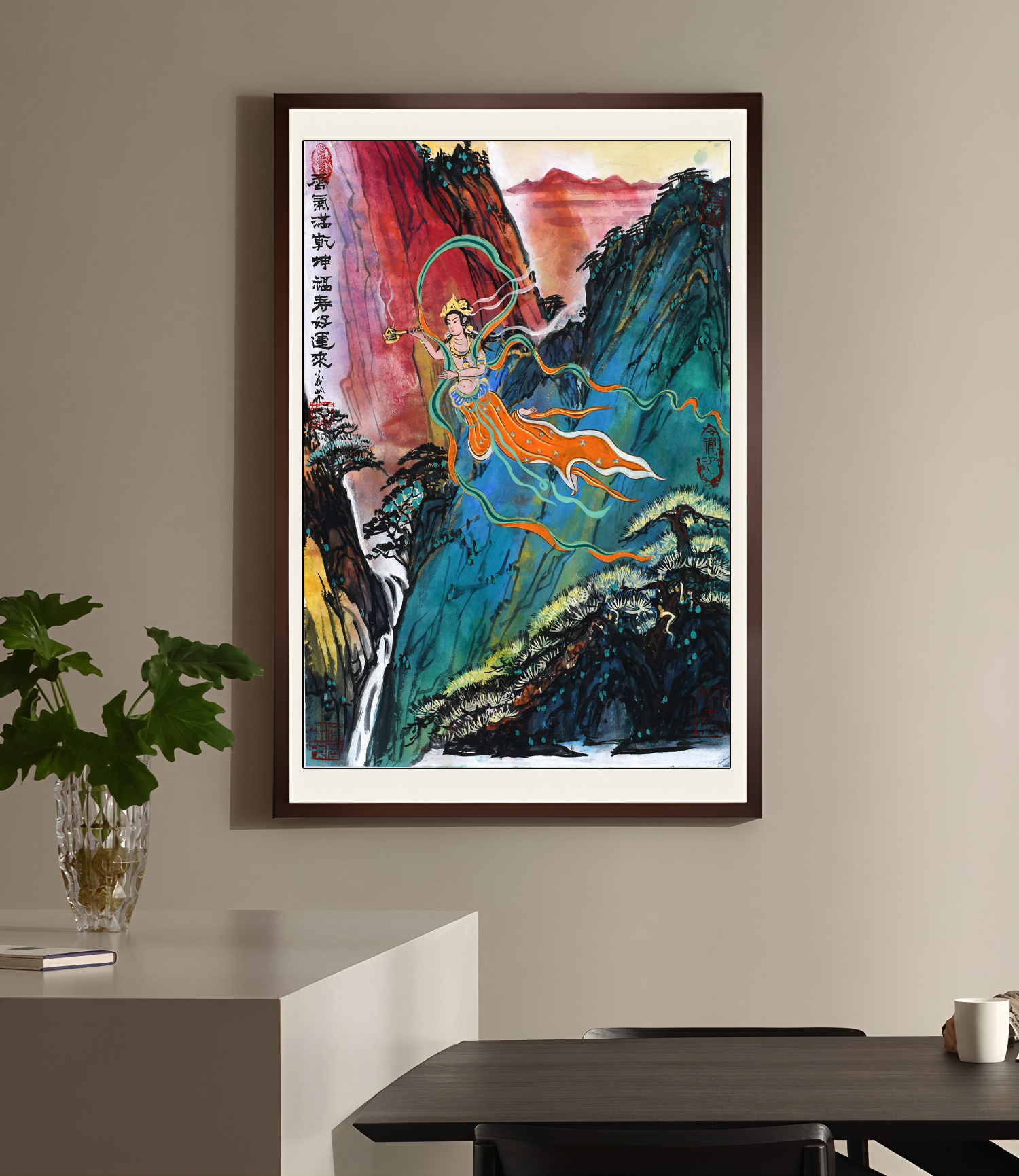 他的线条,如禅音;他的色彩,如莲花初绽。每一笔都似在讲述佛陀的慈悲,每一层晕染都带着觉悟的温度。他曾说:“佛教艺术不是信仰的装饰,而是觉悟的桥梁。”他笔下的《千手观音》不是冷峻的神祇,而是有温度的母亲;他的《菩萨入定》不是宗教的象征,而是人心宁静的镜像。他用画,让信仰有了形象;他用心,让艺术有了灵魂。