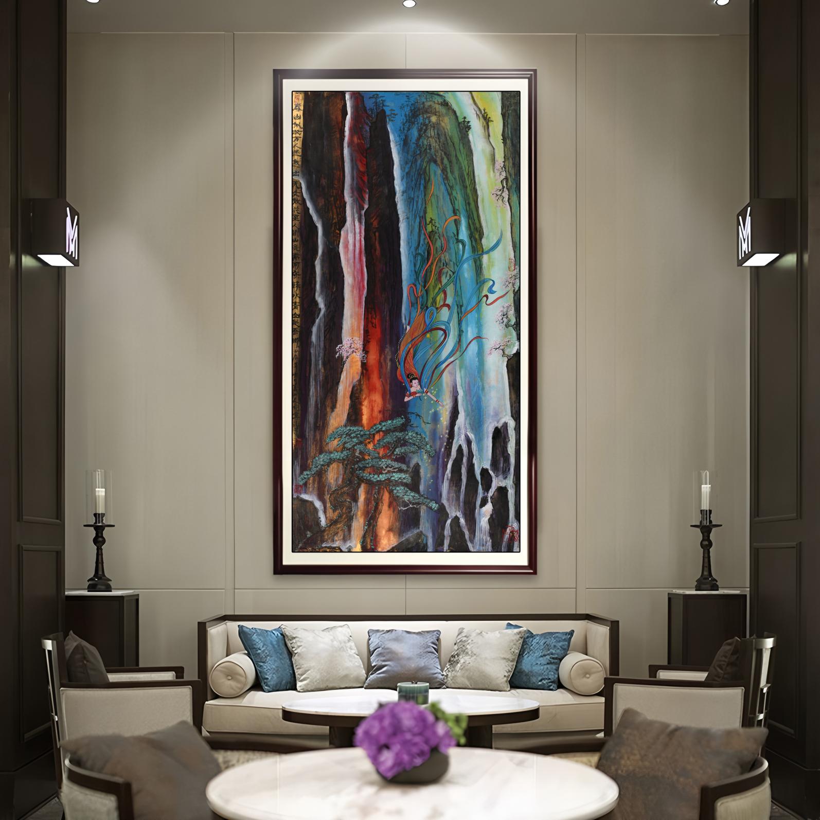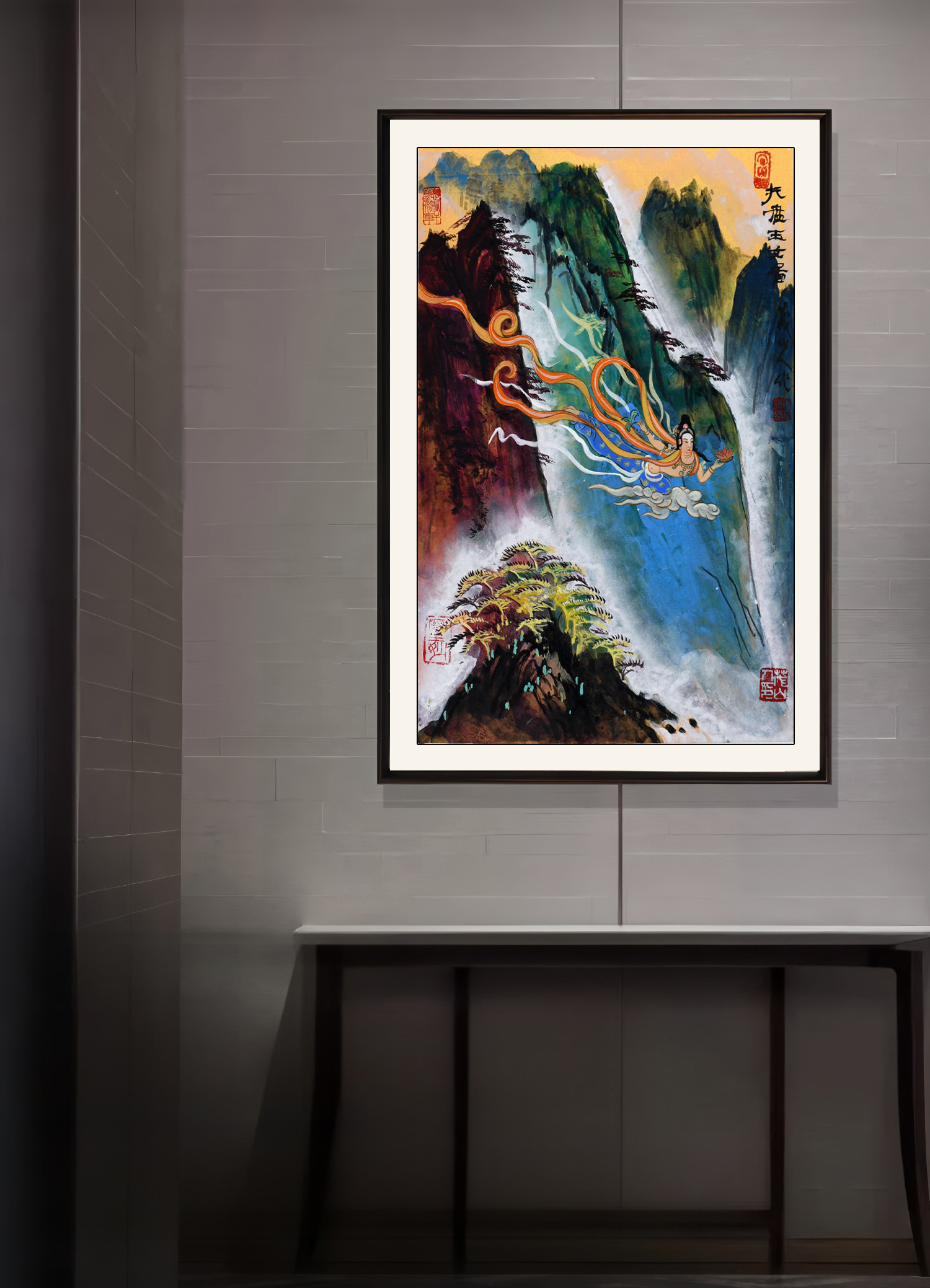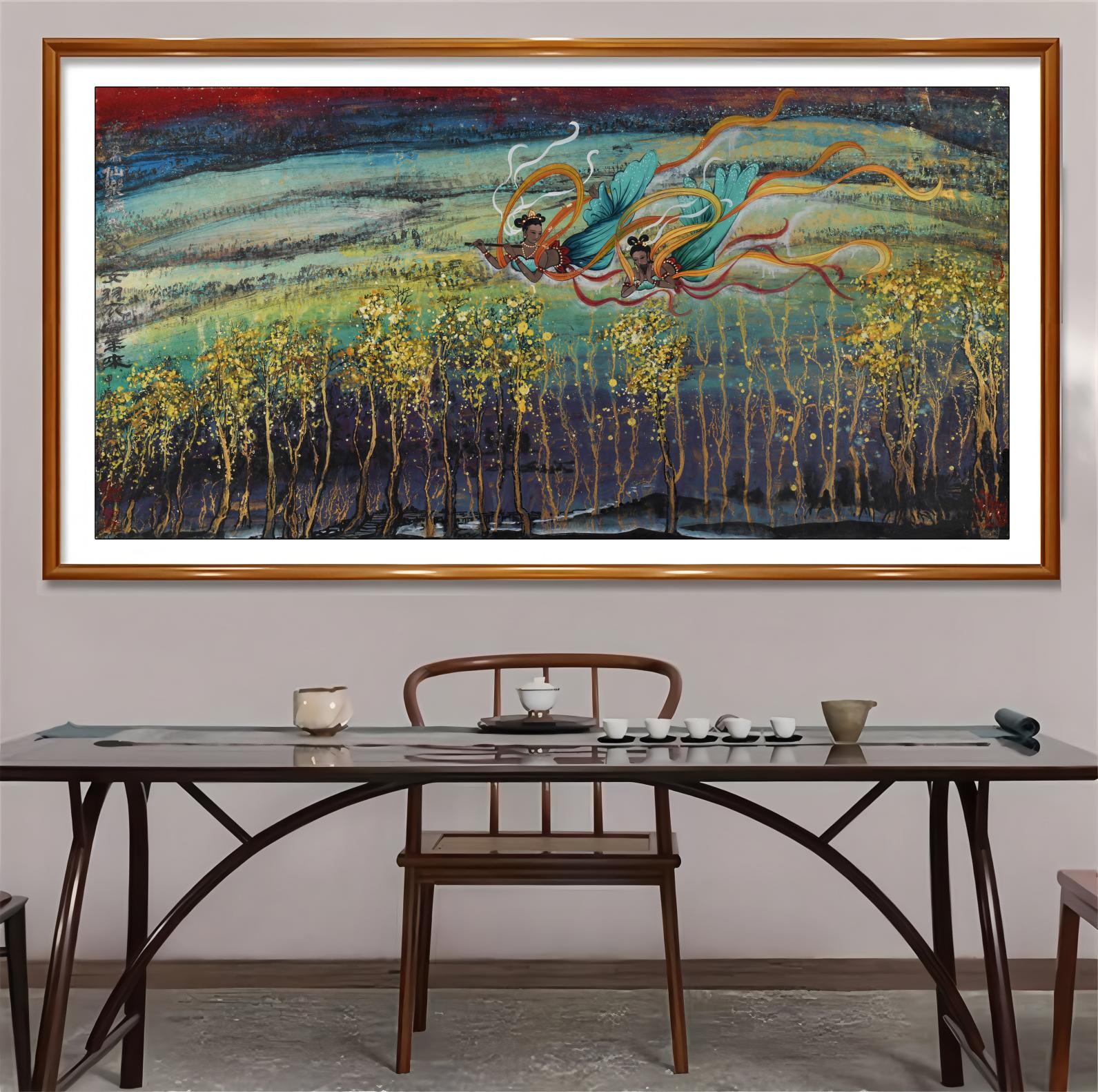 在他的笔下,飞天不再只是壁画上的人物,而是一种精神,一种拂尘而起、超越尘世的力量。每一幅作品,仿佛都带着法音回荡,带着光芒照亮心灵。他的画,不只是画,更像是一场庄严的法会。